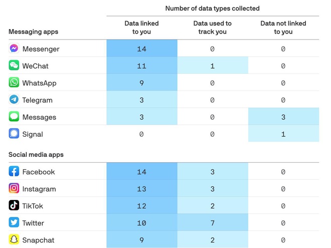 Theo đó, các mạng xã hội thu thập nhiều dữ liệu hơn hẳn ứng dụng nhắn tin. Các dịch vụ nhắn tin của Facebook, như WhatsApp hay Messenger, thu thập nhiều dữ liệu hơn so với ứng dụng cùng loại như Messages, Signal...