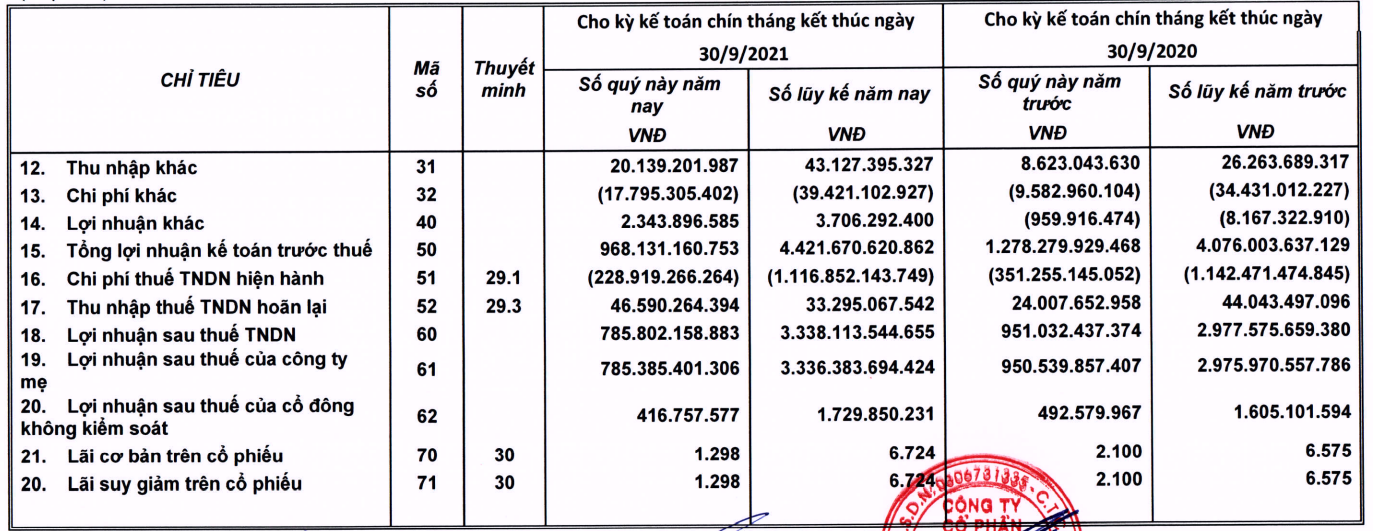 Doanh thu tài chính ghi nhận tăng lên 288 tỷ đồng, chi phí tài chính, chủ yếu là lãi vay tăng 24% lên 164 tỷ đồng. Chi phí bán hàng lớn nhất trong các chi phí tăng 13% lên 4.270 tỷ đồng. Chi phí quản lý cũng tăng 16% lên 975 tỷ đồng.