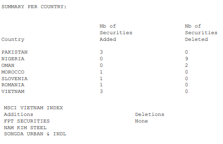 Trong kỳ cơ cấu đầu tiên của năm, MSCI đã thêm mới 9 mã vào rổ MSCI Frontier Markets Indexes, gồm 3 của Pakistan, 1 Morocco, 1 Slovenia, 1 Romania và 3 đến từ thị trường Việt Nam (FTS, NKG và SJS). Ngược lại, 11 mã bị loại khỏi rổ chỉ số, gồm 9 từ Nigeria và 2 của thị trường Oman.