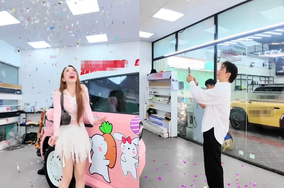 Việt Anh đứng bên cạnh, ghi lại khoảnh khắc Quỳnh Nga hạnh phúc tậu xe mới