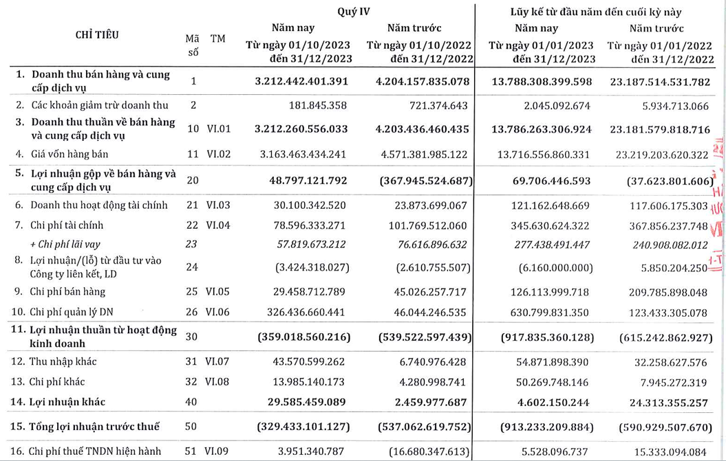 Dù tiết giảm các khoản chi phí, trong đó chi phí tài chính giảm 23% và chi phí bán hàng giảm 35%. Nhưng chi phí quản lý doanh nghiệp gần 330 tỷ đồng, chủ yếu là do trích lập dự phòng nợ xấu 300 tỷ đồng vẫn khiến công ty lỗ ròng 330 tỷ đồng trong quý 4/2023.