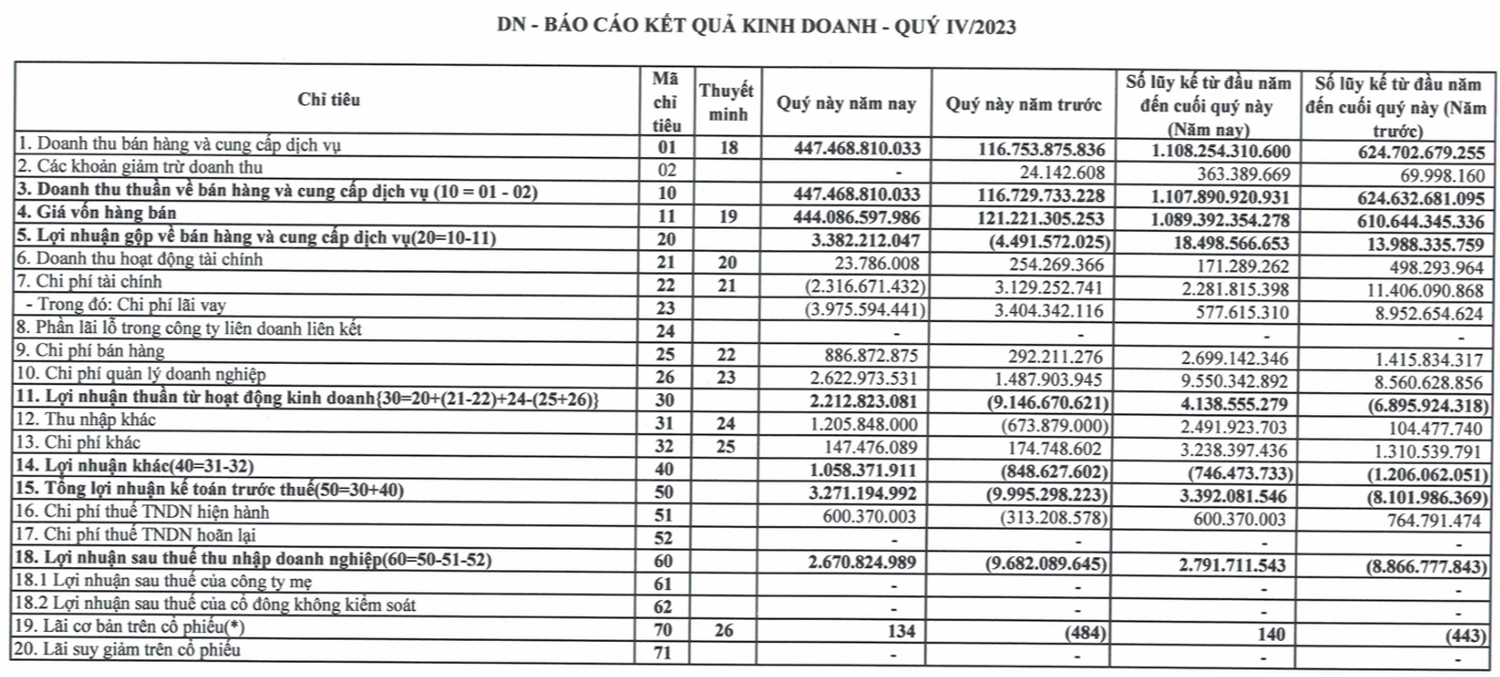 Theo báo cáo tài chính quý 4/2023, Thép Tấm Lá Thống Nhất ghi nhận doanh thu 447 tỷ đồng (gấp 3,8 lần cùng kỳ) và lãi gộp 3,4 tỷ đồng (cùng kỳ lỗ 4,5 tỷ đồng).