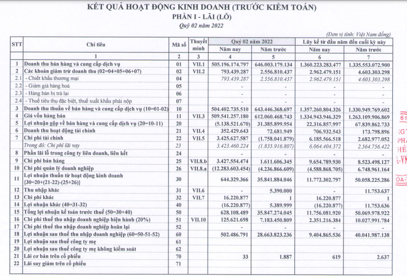 Kết quả kinh doanh quý II/2022 của Thép Vicasa.