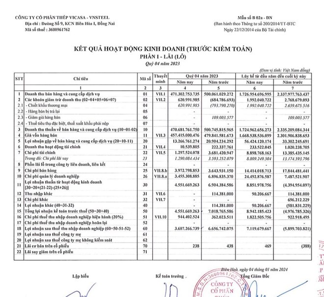 Kết quả, doanh nghiệp ngành thép này ghi nhận 4,5 tỷ đồng lợi nhuận trước thuế trong quý 4/2023, so với cùng kỳ năm 2022 đã giảm 35,7%. Lợi nhuận sau thuế của Vicasa - VNSteel là 3,6 tỷ đồng, giảm 45% so với cùng kỳ.