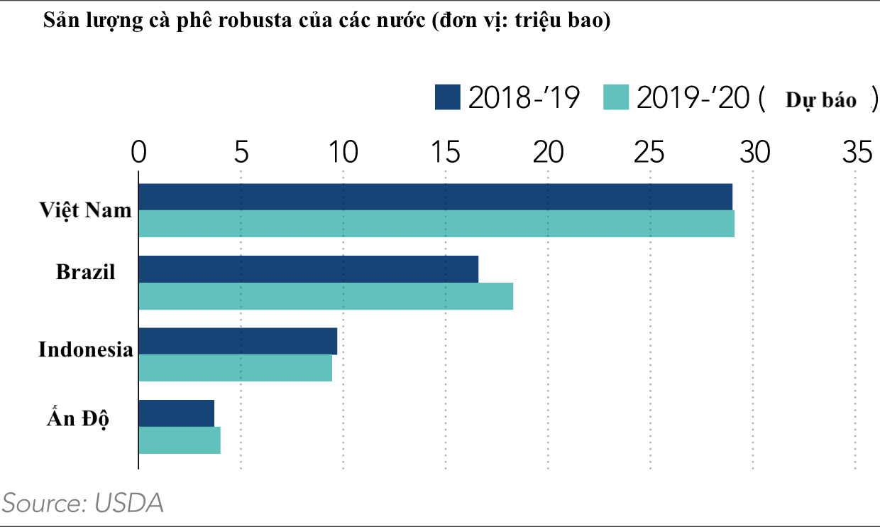 Theo Nikkei Asia Review, sản lượng cà phê robusta của Việt Nam (nguyên liệu chính trong cà phê hòa tan) được dự đoán có mức tăng trưởng 0,3% lên 29,1 triệu bao trong niên vụ 2019 - 2020, theo Bộ Nông nghiệp Mỹ. Mỗi bao có trọng lượng 60 kg. Con số này tăng 10% so với 5 năm trước.