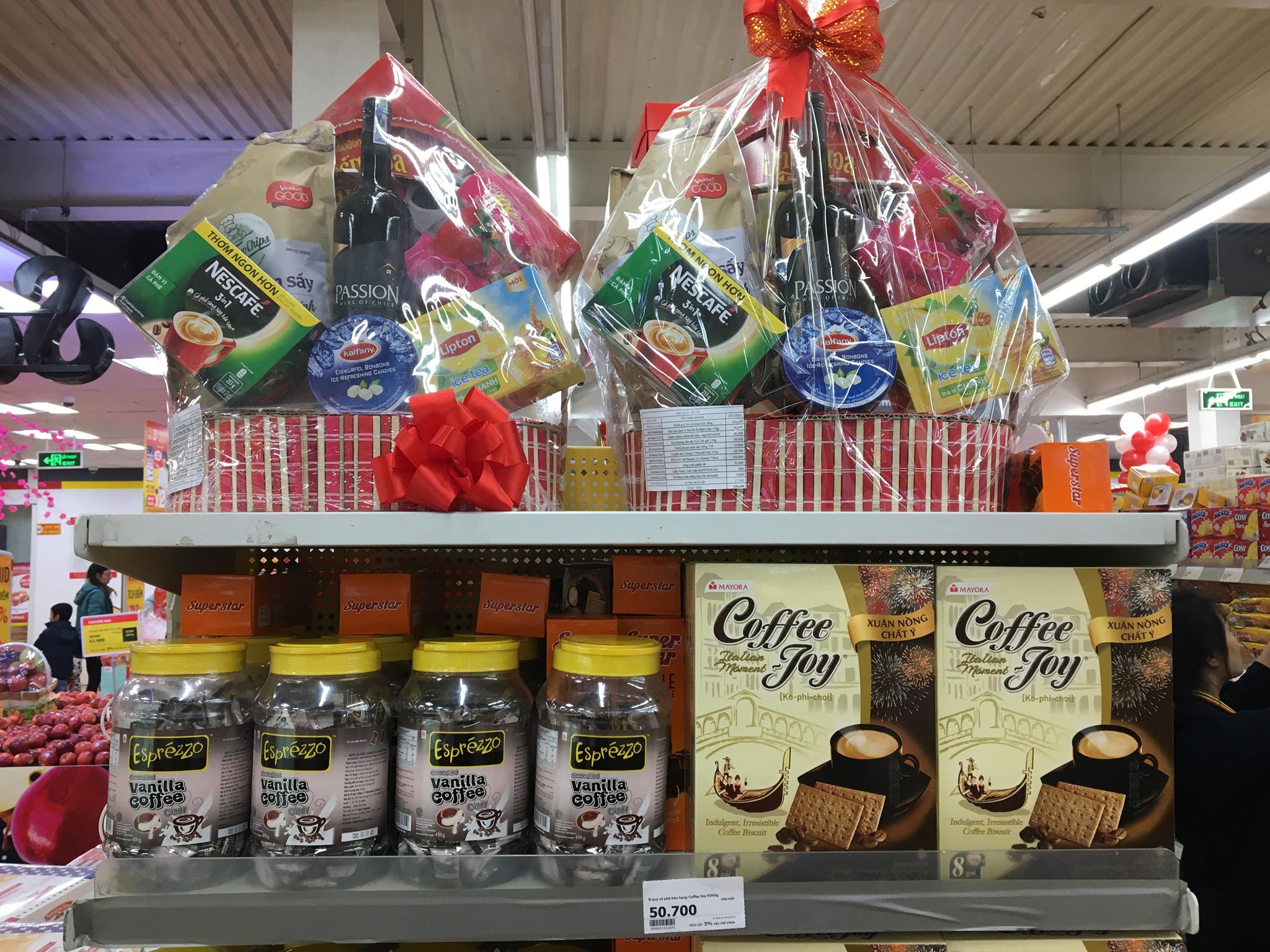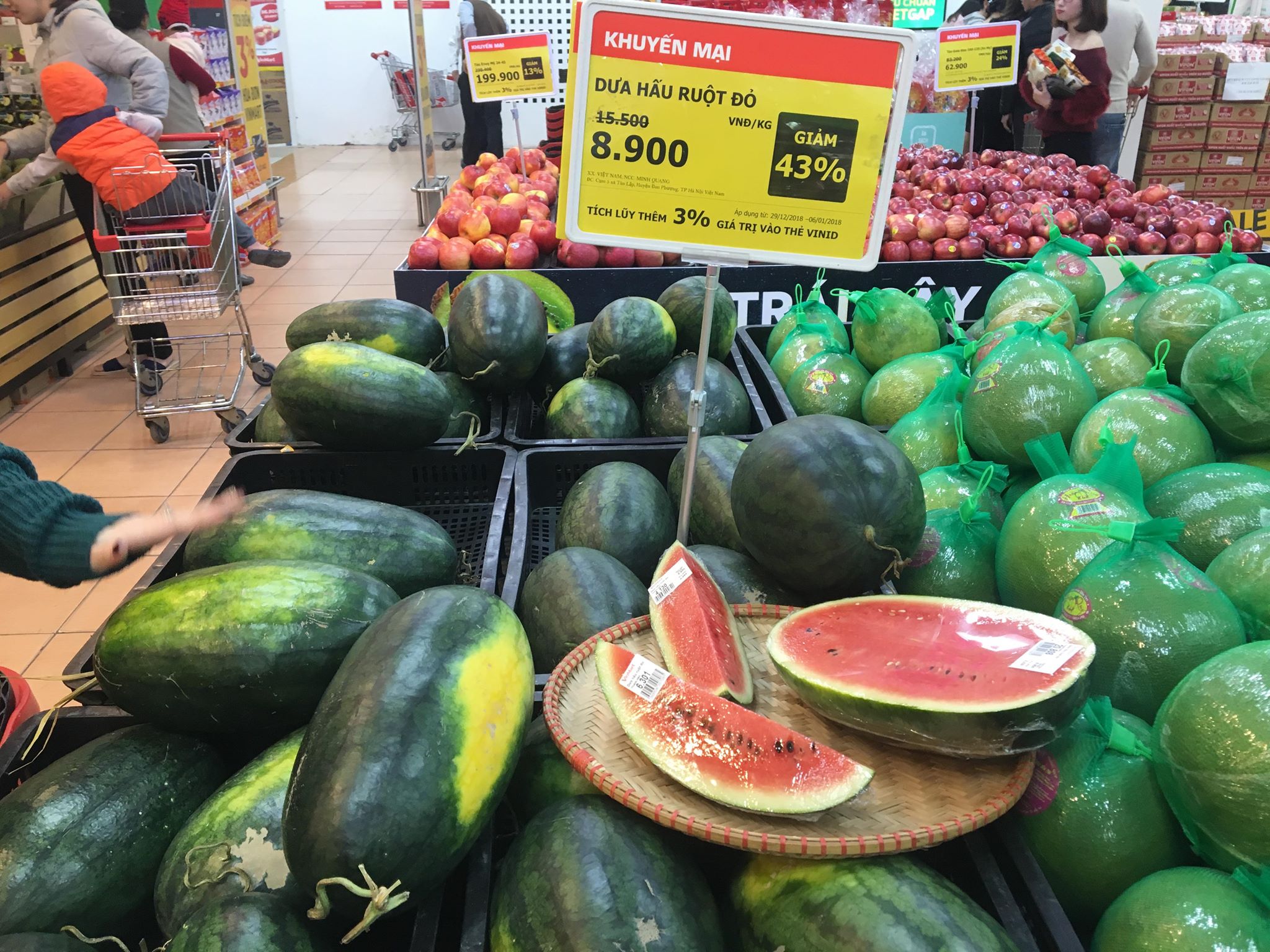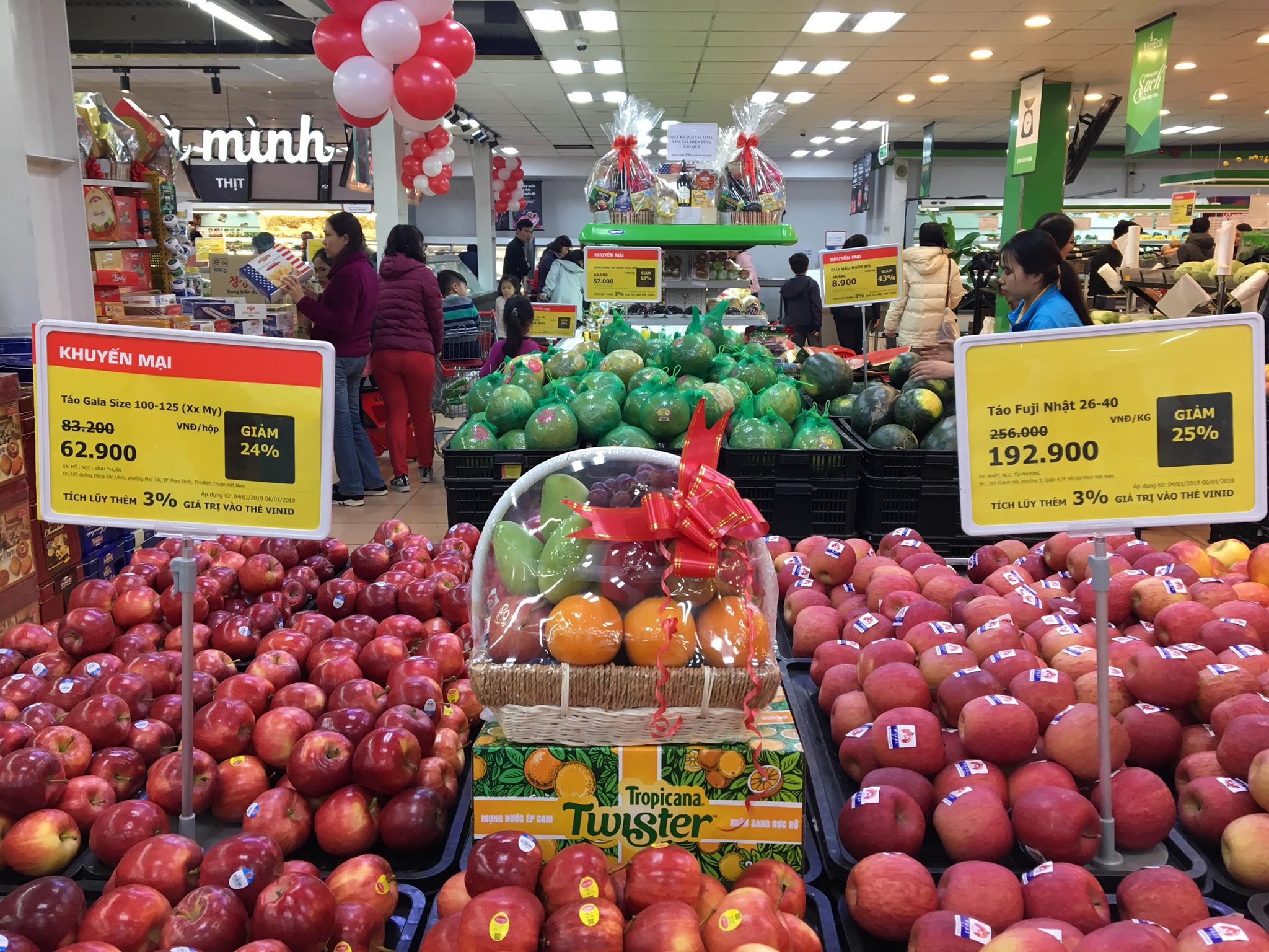 Bên cạnh các mặt hàng bánh kẹo thị các măt hàng hoa quả cũng có nhiều khuyến mãi hấp dẫn. Siêu thị đã đặc biệt thiết kế thêm các giỏ hoa quả để người tiêu dùng có thể đem đi biếu Tết.