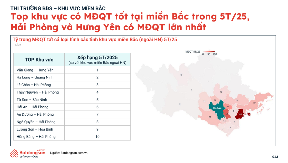 Ở cấp độ địa phương, Hưng Yên và Hải Phòng tiếp tục giữ vị thế hàng đầu về tỷ trọng mức độ quan tâm. Văn Giang (Hưng Yên) và Lê Chân, Thủy Nguyên (Hải Phòng) nằm trong top các khu vực dẫn đầu lượng tìm kiếm tại miền Bắc ngoài Hà Nội trong 5T/2025. Đây đều là các địa bàn hưởng lợi từ hạ tầng kết nối liên vùng, quỹ đất sạch và sự phát triển nhanh của khu công nghiệp, yếu tố hỗ trợ nhu cầu thực lẫn đầu tư.