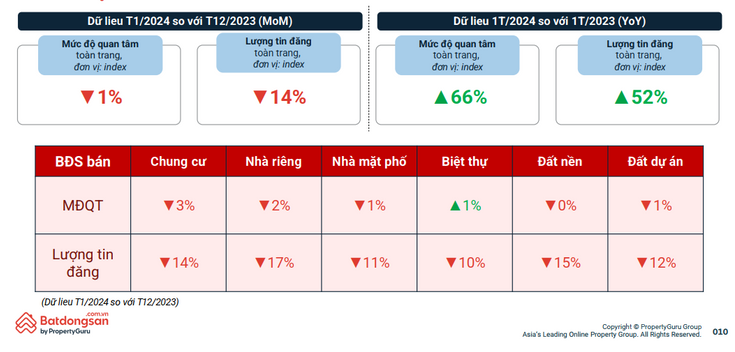 So với đầu năm 2023, thị trường bất động sản đầu năm nay có những dấu hiệu tích cực hơn cả về mức độ quan tâm và lượng tin đăng. Dữ liệu từ đơn vị này cho thấy, nhu cầu tìm kiếm bất động sản bán toàn quốc trong tháng 1/2024 tăng 66% so với cùng kỳ 2023, lượng tin đăng bán bất động sản cũng tăng 52%.