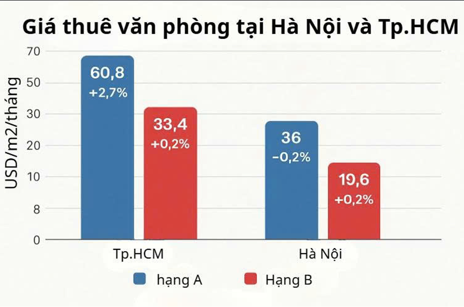 Tại TP.HCM, giá chào thuê văn phòng hạng A trong quý II/2025 đạt 60,8 USD/m²/tháng (tăng 2,7% so với quý trước), trong khi văn phòng hạng B đạt 33,4 USD/m²/tháng (tăng 0,2%). Sự tăng giá phần lớn đến từ dự án mới Marina Central Tower – tòa nhà văn phòng lớn nhất TP.HCM với diện tích sàn 69.400 m², đứng thứ ba tại Việt Nam sau Keangnam Landmark 72 và Capital Place ở Hà Nội.