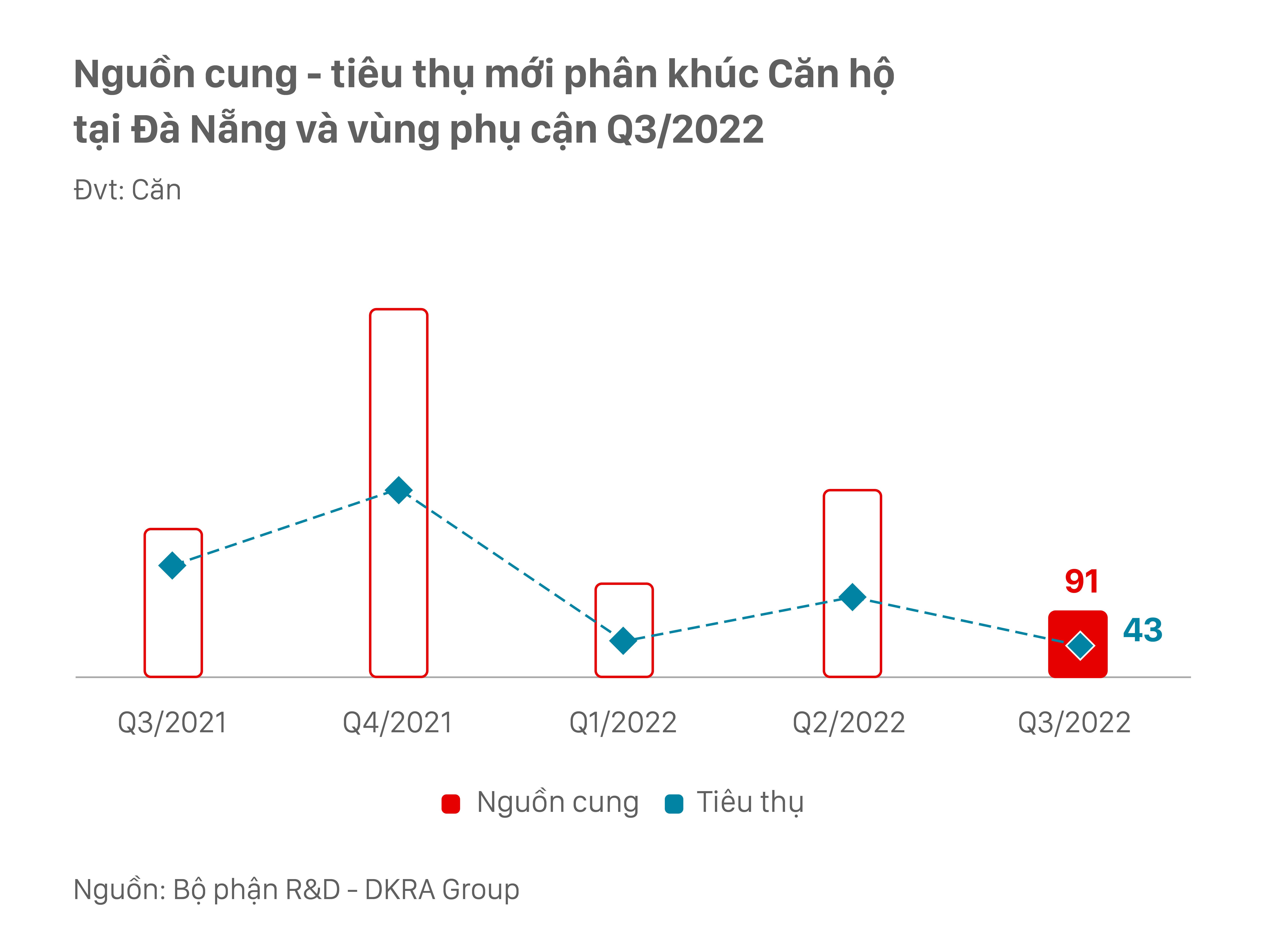 Phân khúc căn hộ trong Quý 3/2022 có 3 dự án mở bán, tập trung toàn bộ tại Đà Nẵng, cung cấp ra thị trường khoảng 91 căn, giảm 64.5% so với quý trước. Tỷ lệ tiêu thụ trên nguồn cung mới chỉ đạt 47% (khoảng 43 căn), giảm 60.6% so với quý trước. Sức cầu chung thị trường sơ cấp và thứ cấp cải thiện hơn so với cùng kỳ năm 2021 (thời điểm giãn cách toàn xã hội), tuy nhiên vẫn ở mức thấp.