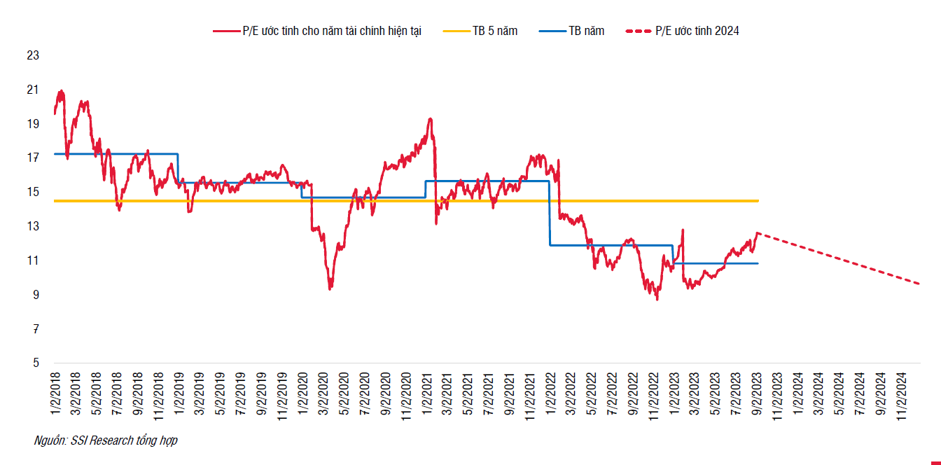 Về mặt định giá, VN-Index đang giao dịch ở mức P/E 12,6 lần cho ước tính 2023. Mức định giá này thấp hơn trung bình 5 năm là 14,5 lần và trung bình năm 2021 là 15,6 lần. Thị trường sẽ tập trung nhiều hơn sang năm 2024 với mức định giá ước tính đang ở mức hấp dẫn là 9,6 lần.