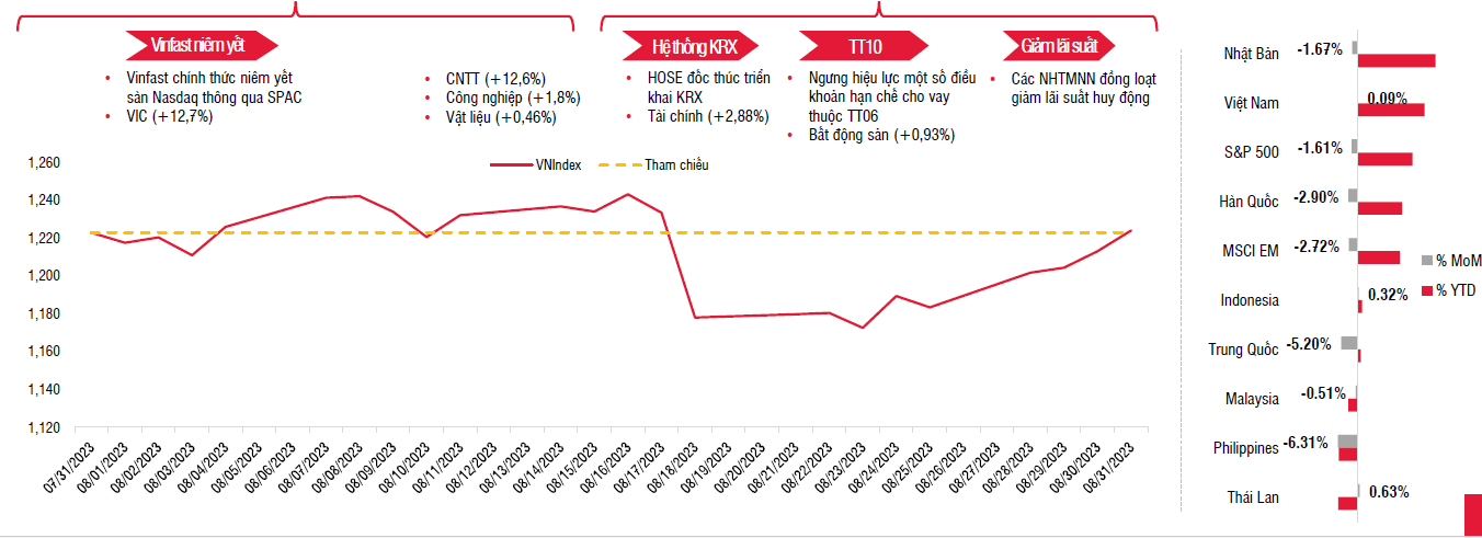 Nhờ vậy, VN-Index khép lại tháng 8 quay trở lại trên mốc tâm lý 1.200 và đóng cửa ở ngưỡng 1.224 điểm, gần như không thay đổi về điểm số so với cuối tháng 7. Thị trường chứng khoán Việt Nam tiếp tục cho thấy diễn biến tích cực hơn so với các nước trong khu vực cả trong tháng 8 và kể từ đầu năm.