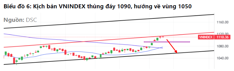 Trong trường hợp này, VN-Index có thể điều chỉnh về vùng 1.050 điểm khi vị thế mở xu hướng (1.080 điểm) bị vi phạm. Tuy nhiên, DSC đánh giá xác suất này thấp hơn bởi VN-Index đã hình thành chuỗi phiên hấp thụ áp lực cung ngắn và trung hạn trước khi vào pha “nước rút”. Hiện tại, vị thế mua lên chủ động đang chiếm ưu thế.
