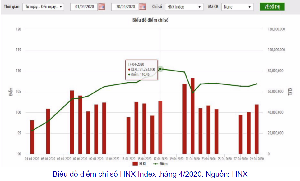 Chỉ số HNX Index tháng 4/2020 có xu hướng tăng điểm từ mức thấp nhất 95,61 điểm vào ngày 1/4/2020. Sau khi đạt mức cao nhất 110,04 điểm vào ngày 17/4/2020, chỉ số HNX Index đã có phiên giảm mạnh và đi ngang tới hết tháng. HNX Index đạt 106,84 điểm tại thời điểm đóng cửa phiên giao dịch cuối cùng của tháng 4/2020, tăng 15,33% so với thời điểm cuối tháng 3. Giá trị vốn hóa bình quân thị trường đạt hơn 193,8 nghìn tỷ đồng.
