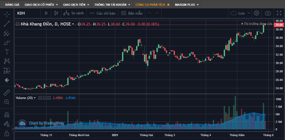Stock Rating của KDH ở mức 88 điểm cho thấy mức xếp hạng tăng trưởng của cổ phiếu là tích cực. Đồ thị giá của KDH đạt mức cao nhất 52 tuần và thoát khỏi mô hình chữ nhật với khối lượng giao dịch tăng đột biến trong phiên 27/5.