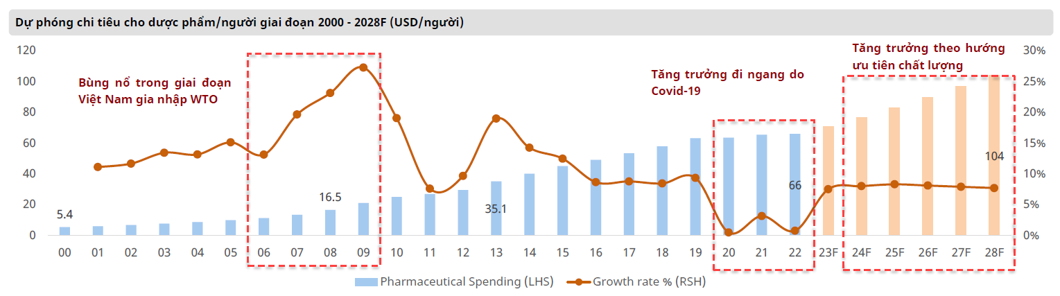 Theo báo cáo phân tích triển vọng ngành chăm sóc sức khỏe của Việt Nam giai đoạn quý 4/2023 - 2024 của Chứng khoán Mirae Asset, tầng lớp trung lưu bùng nổ thúc đẩy mức tiêu thụ Dược phẩm từ đầu những năm 2000. Cơ cấu bệnh tật ngày càng phức tạp kéo theo yêu cầu thuốc ngày càng nâng cao về chất lượng.