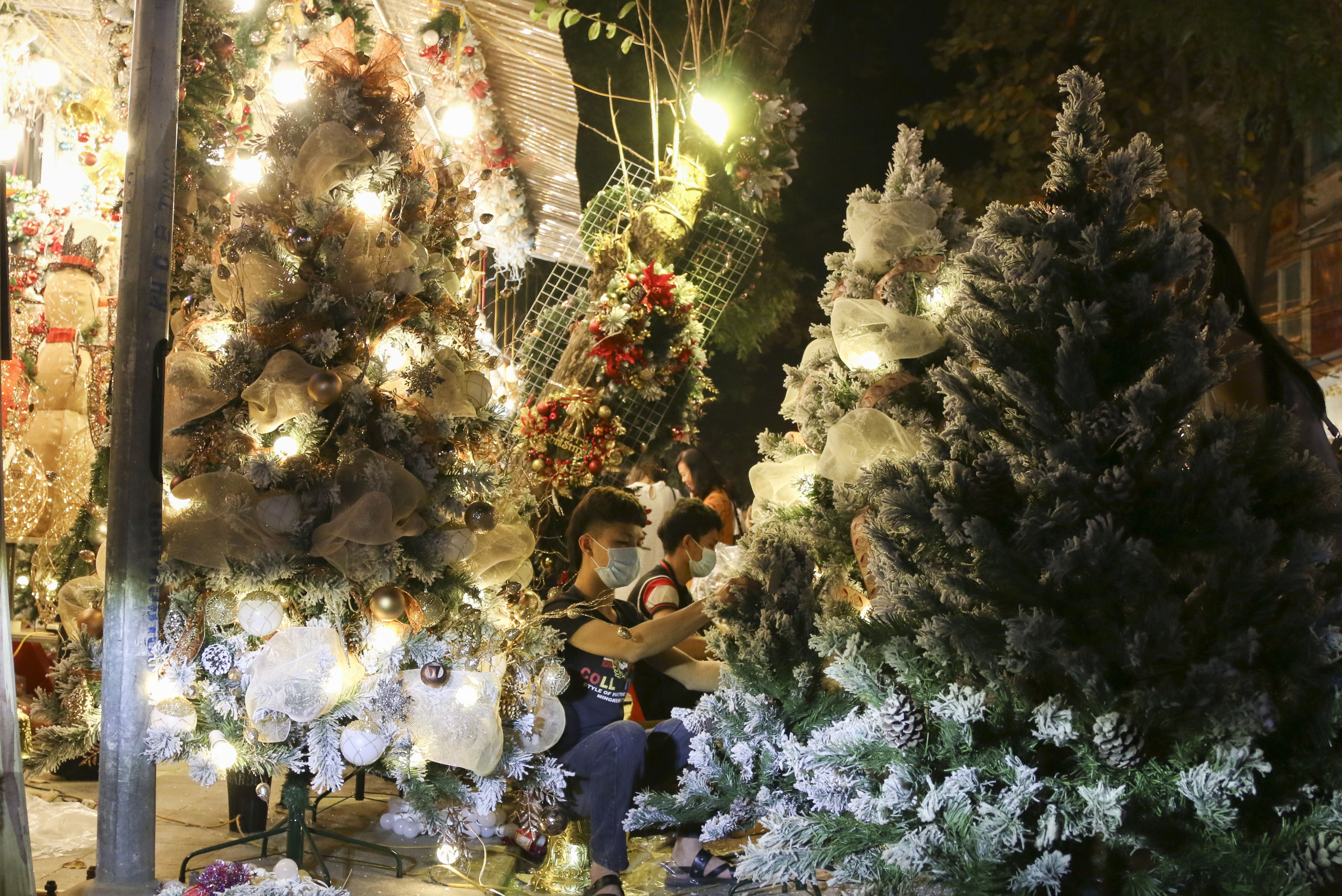 Cùng với cây thông tươi, cây tùng thơm, những mặt hàng quen thuộc được người dân mua về trang trí Giáng sinh hiện đang được mua bán hết sức sôi động. Trên một số tuyến phố tại Hà Nội trong những ngày này ngập tràn màu đỏ, màu xanh, màu trắng của những cây thông, các loại chuông, quả châu, con tuần lộc, ông già tuyết… Khách đến mua đồ về trang trí rất tấp nập.