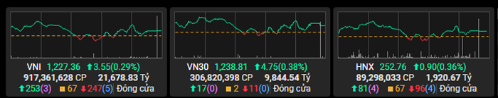 Tình hình thị trường được cải thiện về cuối phiên giao dịch. Chốt phiên 15/9, VN-Index tăng 3,55 điểm (0,29%) lên 1.227,36 điểm, thanh khoản khớp lệnh ở mức 917 triệu đơn vị, tương đương giá trị 21.679 tỷ đồng, giảm 19,7% so với phiên 14/9 và thấp nhất kể từ đầu tháng 9 đến nay.