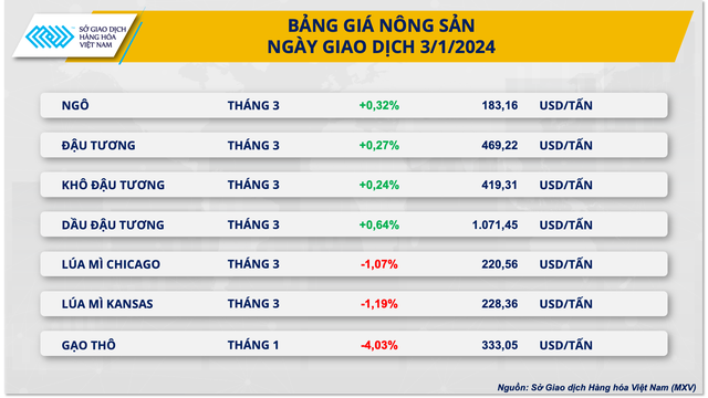 Trên thị trường nông sản, sau khi giảm về vùng giá thấp nhất trong vòng 6 tháng vừa qua, giá đậu tương hợp đồng kỳ hạn tháng 3 đã hồi phục trở lại trong ngày giao dịch hôm qua. Tình hình vụ mùa tại khu vực Nam Mỹ tiếp tục là tâm điểm chú ý của thị trường khi thời tiết tại các nước trong khu vực đang dần được cải thiện.
