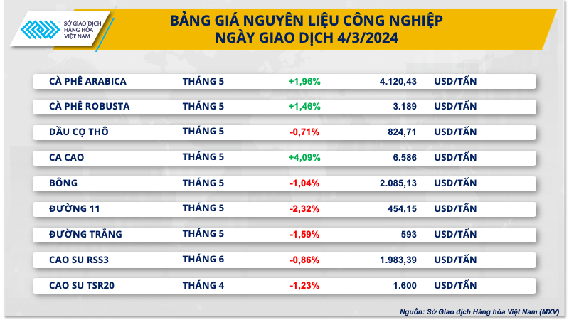 Với Robusta, nắng nóng kéo dài tại khu vực gieo trồng cà phê trọng điểm của Việt Nam đã làm gia tăng lo ngại về triển vọng nguồn cung kém khả quan. Hơn nữa, tồn kho Robusta trên Sở ICE-EU tiếp tục giảm 600 tấn trong phiên 3/3, kéo tổng lượng cà phê lưu trữ tại đây về còn 23.590 tấn.