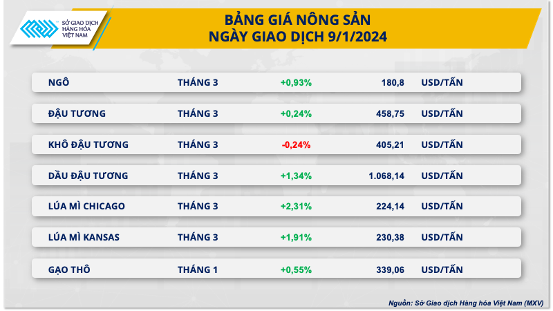 Số liệu từ Sở Giao dịch Hàng hóa Việt Nam (MXV) cho thấy, lực mua áp đảo trên thị trường hàng hóa nguyên liệu trong ngày hôm qua (9/1). Đáng chú ý, ngày hôm qua, giá của các mặt hàng nhóm nông sản, năng lượng và nguyên liệu công nghiệp đồng loạt tăng.