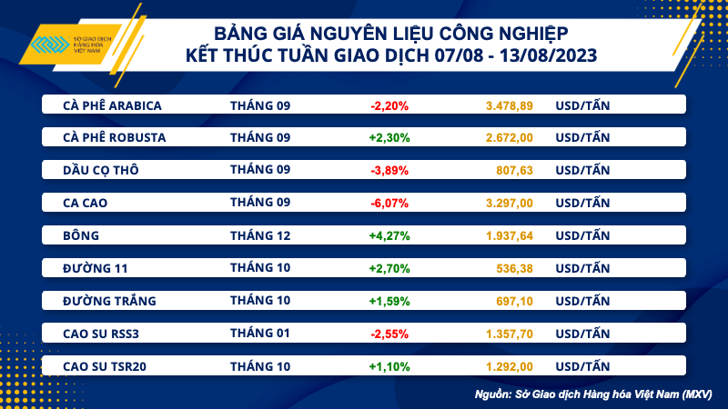 Số liệu từ Sở Giao dịch Hàng hóa Việt Nam (MXV) cho thấy, đóng cửa tuần giao dịch (07/08 - 11/08), mức giảm mạnh của nhiều mặt hàng quan trọng.