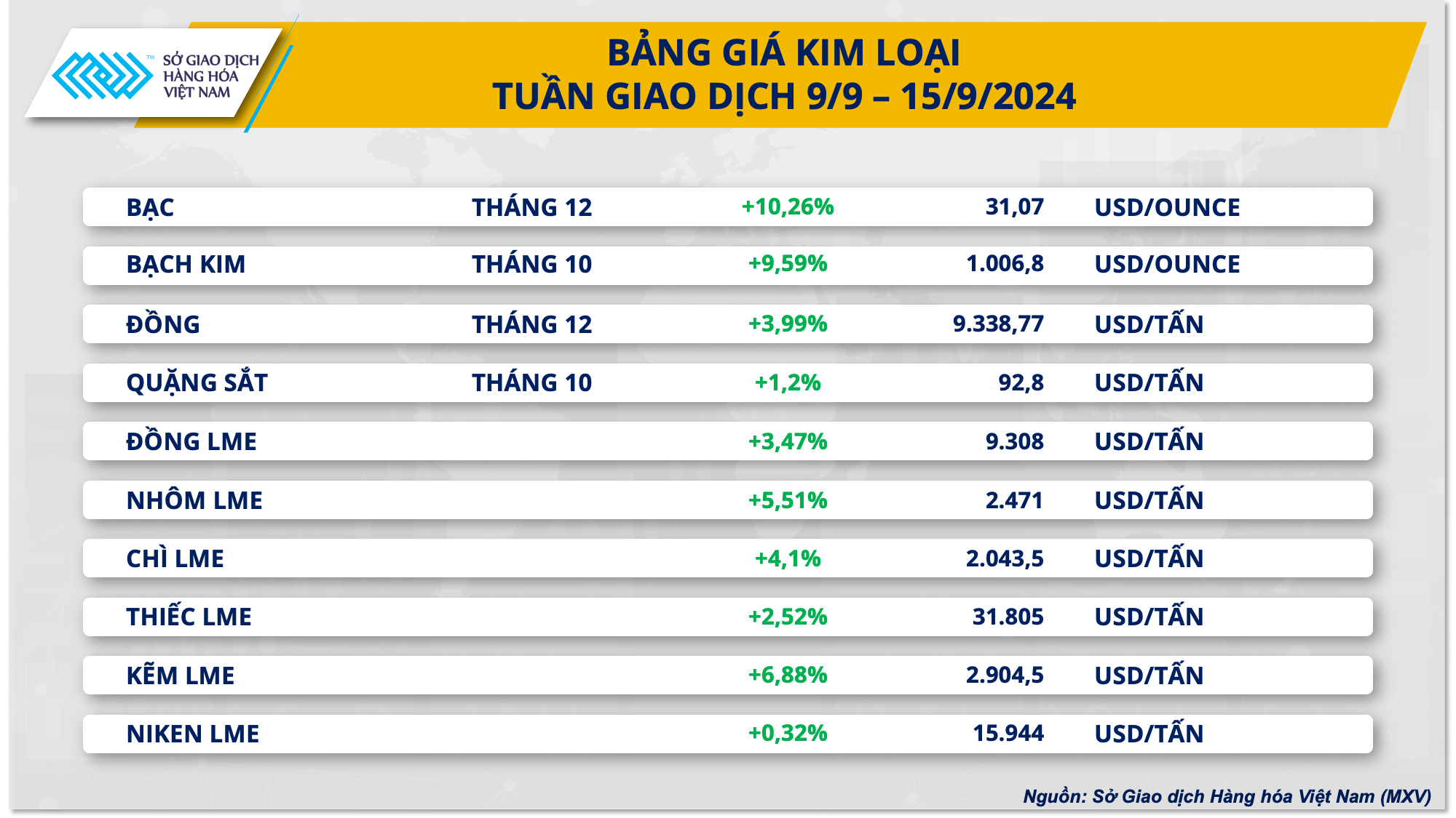 Sở Giao dịch Hàng hóa Việt Nam (MXV) cho biết lực mua mạnh đã diễn ra trên thị trường hàng hóa nguyên liệu tuần giao dịch vừa qua (9-15/9). Giá nhiều mặt hàng tăng vọt nhờ được hỗ trợ từ yếu tố vĩ mô và cung cầu.