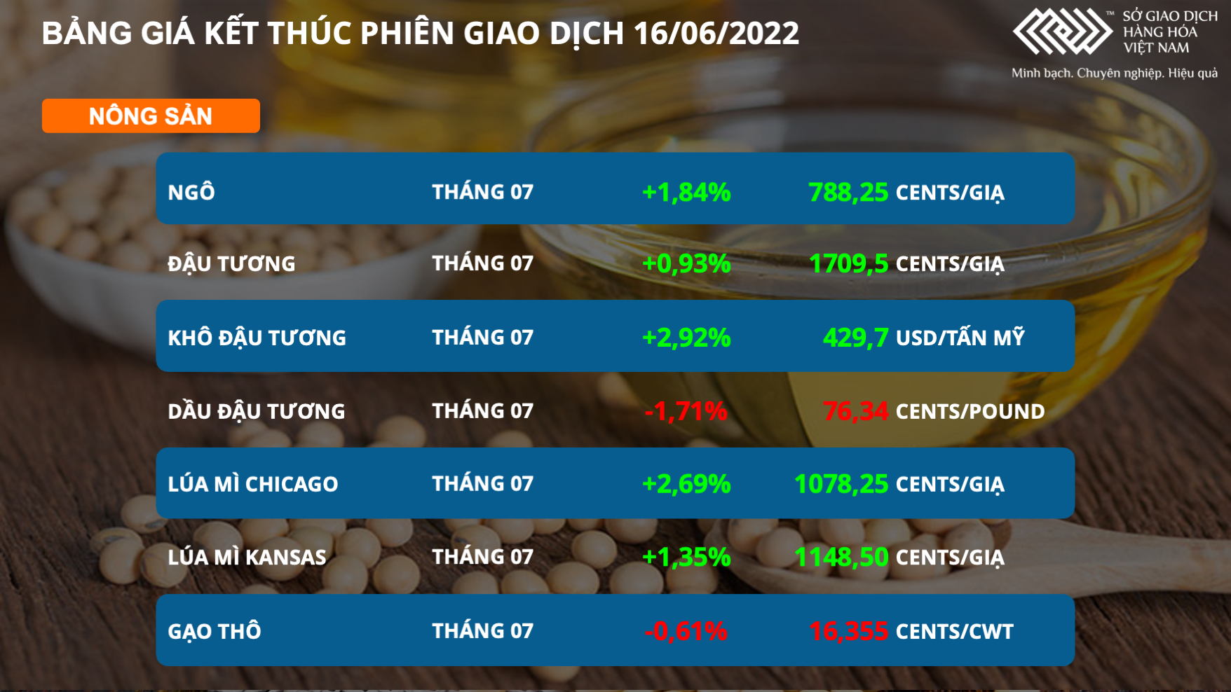 Bảng giá nông sản kết thúc phiên giao dịch 16/06 (Nguồn: MXV)