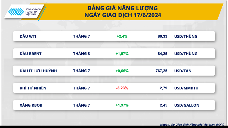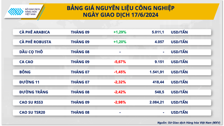 Theo số liệu từ Sở Giao dịch hàng hóa Việt Nam (MXV), đóng cửa ngày 17/6, thị trường hàng hóa nguyên liệu thế giới diễn biến phân hoá. Các mặt hàng trong nhóm năng lượng tăng giá trong khi nhóm nông sản, nguyên liệu công nghiệp và kim loại đồng loạt giảm.