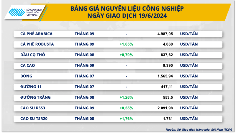 Thông tin từ Sở Giao dịch Hàng hoá Việt Nam (MXV) cho biết, thị trường tương đối trầm lắng trong phiên giao dịch ngày 19/6, khi phần lớn các mặt hàng liên thông với Sở Giao dịch tại Mỹ đóng cửa nghỉ lễ Juneteenth. Theo đó, nhóm nông sản và một số các mặt hàng nguyên liệu công nghiệp ngừng giao dịch. Trong khi đó, thị trường năng lượng và kim loại đóng cửa phiên sớm.