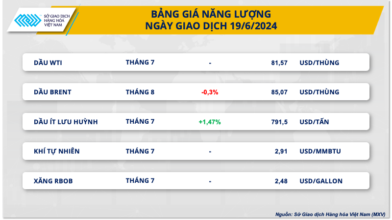 Trên thị trường năng lượng, tính tới 1 giờ 30 phút sáng 20/6, giá dầu WTI giảm khoảng 0,12% xuống mức 81,47 USD/thùng. Trong khi đó, dầu Brent giảm 0,3% xuống 85,07 USD/thùng. Giá dầu giảm nhẹ sau báo cáo trái ngược kỳ vọng của thị trường từ Viện Dầu khí Mỹ (API) cũng như dữ liệu nhập khẩu thất vọng của Nhật Bản trong bối cảnh các thông tin nguồn cung được cải thiện.