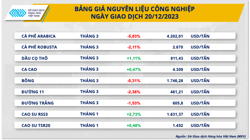 Số liệu từ Sở Giao dịch Hàng hóa Việt Nam (MXV) cho thấy, thị trường hàng hóa nguyên liệu thế giới ngày hôm qua (20/12) diễn biến tương đối trái chiều. Sắc đỏ phủ kín bảng giá nông sản. Trong khi giá nhiều mặt hàng nhóm năng lượng và kim loại lại đi lên.