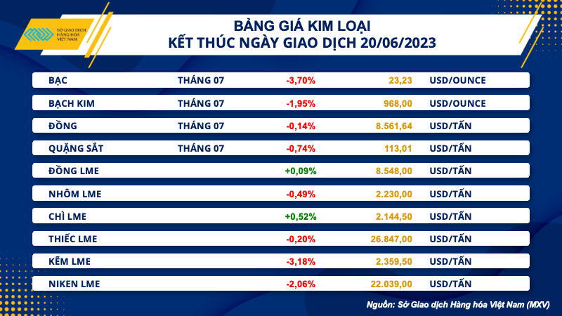 Trên thị trường kim loại, đóng cửa hôm qua ngày 20/06, giá bạc dẫn dắt đà giảm của thị trường kim loại khi đánh mất 3,7% xuống còn 23,23 USD/ounce, đánh dấu mức giảm mạnh nhất trong vòng gần 6 tuần. Giá bạch kim suy yếu 1,95% xuống 968 USD/ounce.