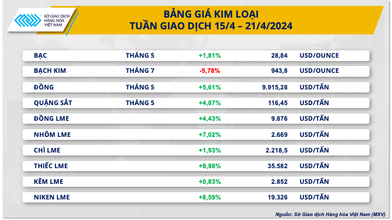 Số liệu Sở Giao dịch Hàng hóa Việt Nam (MXV) cho thấy, kết thúc tuần giao dịch 15 – 21/4, mặc dù giá hàng hoá biến động rất mạnh.