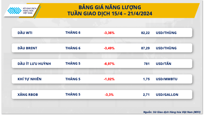 Trên thị trường kim loại, giá dầu ghi nhận tuần giao dịch 15 – 21/4 với biến động rất mạnh, có thời điểm tăng cao trước lo ngại về rủi ro địa chính trị, nhưng cũng hạ nhiệt nhanh chóng bởi các áp lực tâm lý được giải toả. Ngoài ra, áp lực kinh tế vĩ mô cũng ảnh hưởng tới triển vọng nhu cầu tiêu thụ xăng dầu. Chốt tuần, giá dầu WTI giảm 3,36% xuống 82,22 USD/thùng. Dầu Brent mất mốc 90 USD/thùng, giảm 3,49% xuống 87,29 USD/thùng.