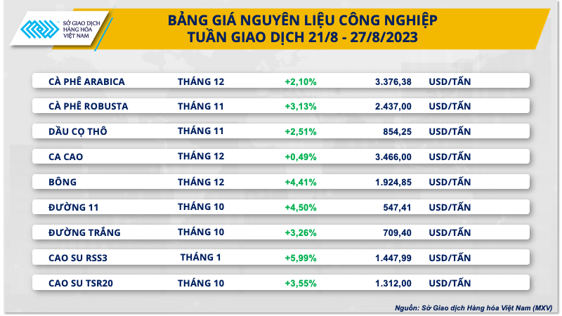 Đối với nhóm nguyên liệu công nghiệp, giá hai mặt hàng đường đồng loạt tăng mạnh với mức tăng lần lượt là 4,5% của đường 11 và 3,26% của đường trắng. Theo MXV, việc Ấn Độ lên kế hoạch cấm xuất khẩu đường trong niên vụ 2023/24 khiến thị trường lo ngại thiếu hụt nguồn cung trên thị trường toàn cầu, từ đó đẩy mạnh lực mua mặt hàng này.