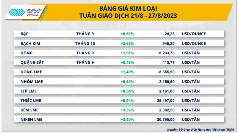 Trên thị trường kim loại, đóng cửa tuần giao dịch 21/8 – 27/8, tất cả các mặt hàng nhóm kim loại đồng loạt tăng giá. Đối với nhóm kim loại quý, giá bạc và bạch kim đứt chuỗi giảm 5 tuần liên tiếp, trong khi giá vàng lấy lại mốc 1.900 USD/ounce, chấm dứt chuỗi giảm 4 tuần liên tiếp. Cụ thể, giá bạc bứt phá 6,6% lên 24,23 USD/ounce, giá bạch kim tăng 3,63%, đóng cửa tuần tại mức 948,3 USD/ounce. Giá vàng lên mức 1.914,5 USD/ounce sau khi tăng 1,39%.
