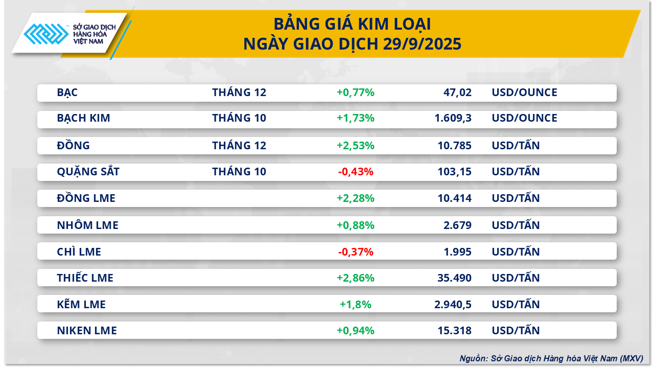 Theo Sở Giao dịch Hàng hóa Việt Nam (MXV), thị trường hàng hóa toàn cầu chững lại sau chuỗi 5 phiên khởi sắc. Năng lượng dẫn dắt đà giảm với giá dầu thô lao dốc tới 3% trước tín hiệu nguồn cung cải thiện. Trong khi đó, đồng hưởng lợi từ đà suy yếu của USD và lo ngại thắt chặt nguồn cung, ghi nhận phiên tăng thứ hai liên tiếp.