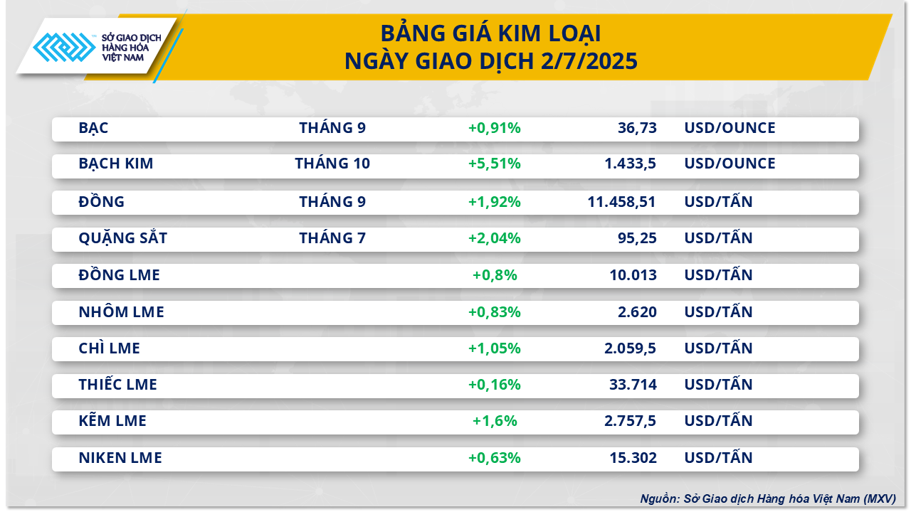 Sở Giao dịch Hàng hóa Việt Nam (MXV) cho biết dòng tiền đầu tư mạnh mẽ đang quay lại thị trường hàng hóa nguyên liệu thế giới, lực mua áp đảo trong phiên giao dịch hôm qua. Đáng chú ý, tâm lý tích cực đang lan tỏa trên thị trường năng lượng sau khi Tổng thống Mỹ cho biết đã đạt được thỏa thuận thương mại với Việt Nam.