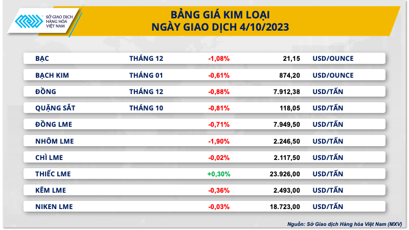 Đối với thị trường kim loại, khép lại ngày giao dịch 4/10, sắc đỏ tiếp tục bao trùm bảng giá thị trường kim loại. Trong nhóm kim loại quý, giá bạc dẫn dắt đà giảm của nhóm khi giảm 1,08% xuống 21,14 USD/ounce, đánh dấu 4 phiên giảm liên tiếp của giá bạc. Trong khi đó, giá bạch kim nối dài đà giảm sang phiên thứ ba liên tiếp, đóng cửa tại mức 874,2 USD/ounce, sau khi giảm 0,61%. Giá vàng duy trì đà giảm sang phiên thứ 8 liên tiếp khi giảm 0,1% xuống 1.821 USD/tấn.