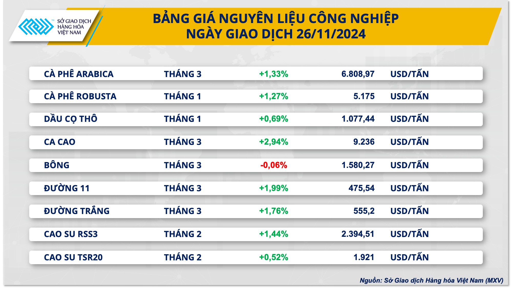 Theo Sở Giao dịch Hàng hóa Việt Nam (MXV), thị trường hàng hóa nguyên liệu thế giới diễn biến phân hóa trong phiên giao dịch ngày 26/11. Đáng chú ý, nhóm nguyên liệu công nghiệp dẫn dắt xu hướng tăng của thị trường, trong đó giá cà phê Arabica leo lên mức cao kỷ lục trong vòng 27 năm qua.
