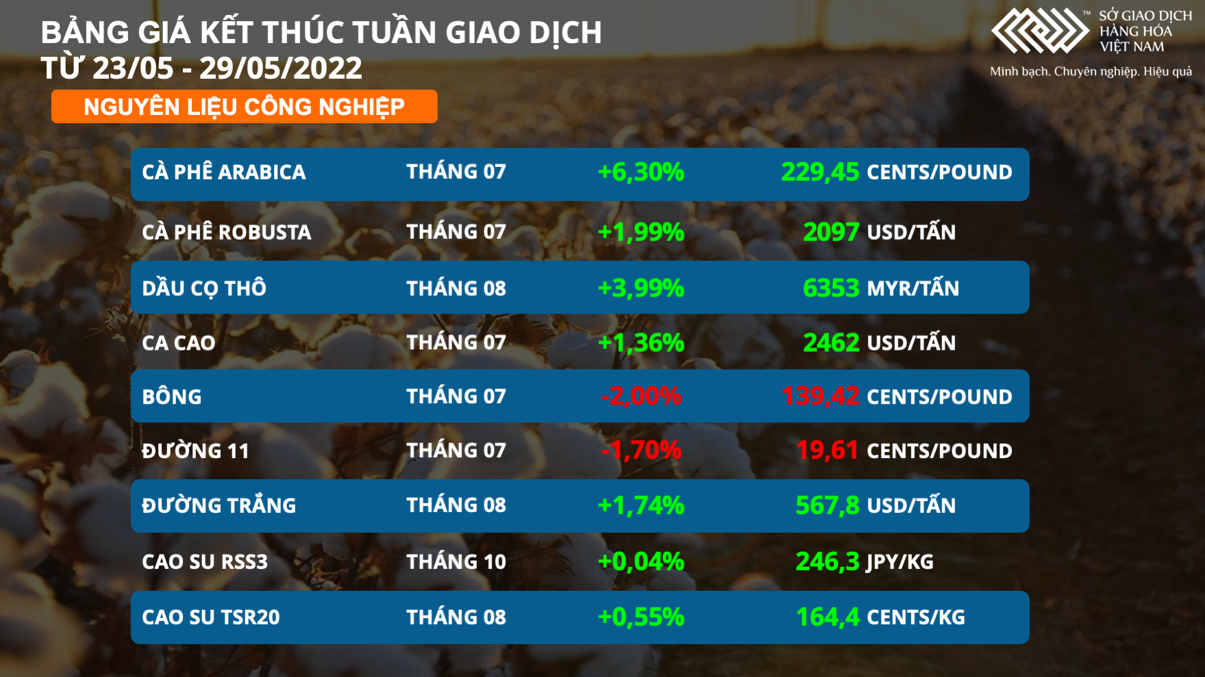 Kết thúc tuần giao dịch 23/05 – 29/05, sắc xanh vượt trội trên bảng giá 31 mặt hàng đang liên thông trực tiếp với thế giới tại Sở Giao dịch Hàng hóa Việt Nam. Trong đó, giá dầu thế giới tăng mạnh vượt mức 115 USD/thùng.
