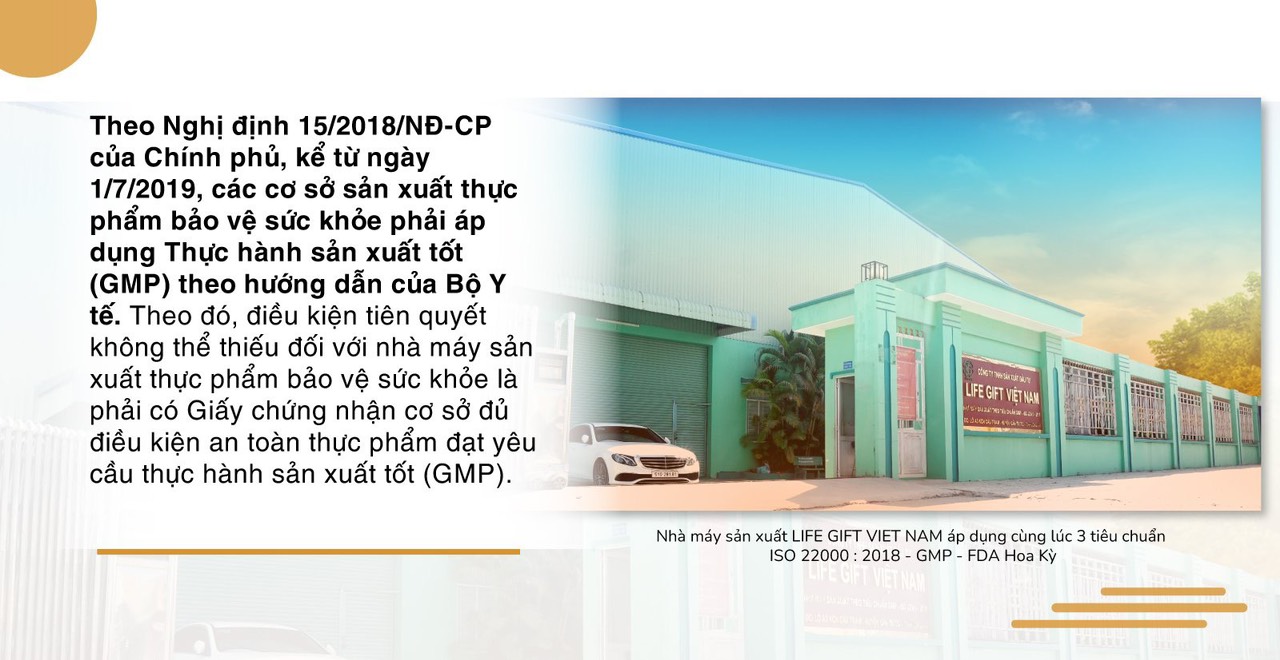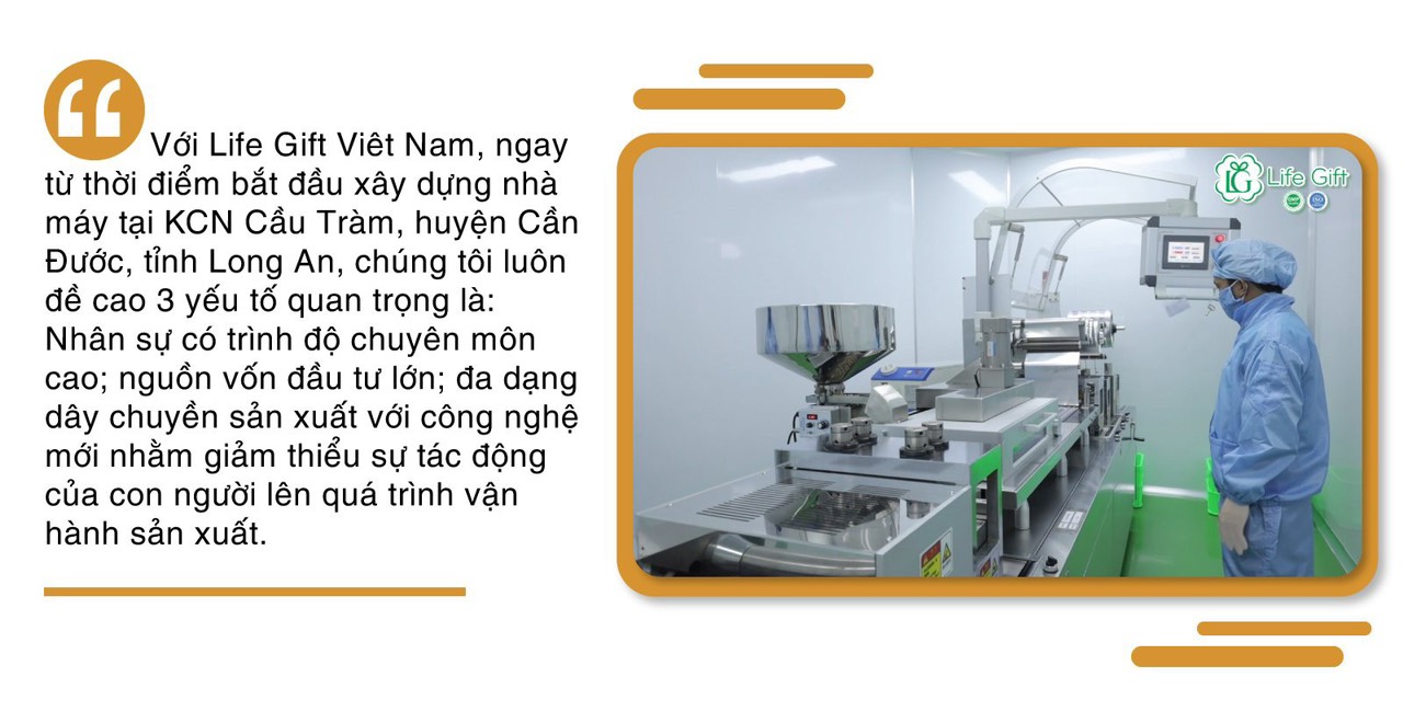 Với Life Gift Viêt Nam, ngay từ thời điểm bắt đầu xây dựng nhà máy tại KCN Cầu Tràm, huyện Cần Đước, tỉnh Long An, chúng tôi luôn đề cao 3 yếu tố quan trọng là: Nhân sự có trình độ chuyên môn cao; nguồn vốn đầu tư lớn; đa dạng dây chuyền sản xuất với công nghệ mới nhằm giảm thiểu sự tác động của con người lên quá trình vận hành sản xuất. Đặc biệt, để bảo đảm nhà máy đạt tiêu chuẩn GMP, chúng tôi đã ký kết hợp tác với một đơn vị có thâm niên trong ngành tại Malaysia tư vấn, chuyển giao công nghệ, theo dõi tiến độ, kiểm tra, đánh giá năng lực nhà thầu xây dựng, đơn vị cung ứng trang thiết bị, xây dựng các quy trình quản lý chất lượng, đào tạo nâng cao chuyên môn cho đội ngũ nhân sự. Nhờ có sự chuẩn bị kỹ lưỡng từ đầu, Life Gift Việt Nam đã được Cục An toàn thực phẩm (Bộ Y tế), cấp giấy chứng nhận GMP. Ngoài tiêu chuẩn bắt buộc trên, chúng tôi cũng áp dụng đồng thời cả hai tiêu chuẩn ISO22.000-2018; FDA. Ngoài những công thức sản phẩm được chuyển giao từ nước ngoài, bộ phận nghiên cứu và triển khai của chúng tôi cũng tự nghiên cứu phát triển nhiều sản phẩm. Đồng thời, chúng tôi đã ký kết hợp tác với Khoa Dược - Trường Đại học Nguyễn Tất Thành để tiếp nhận chuyển giao nhiều quy trình, công nghệ và các đề tài nghiên cứu khoa học phục vụ việc sản xuất ra những sản phẩm thực phẩm bảo vệ sức khoẻ chất lượng.