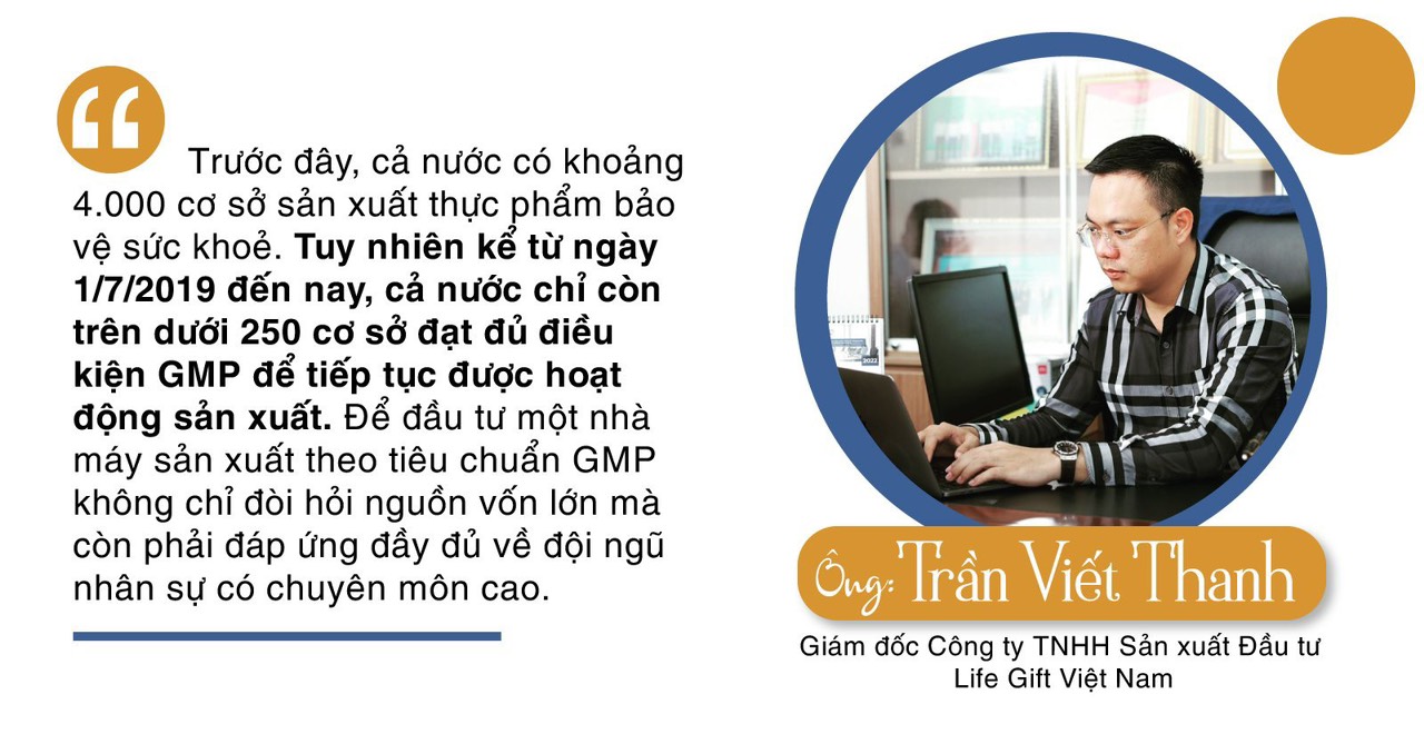 Ông Trần Viết Thanh: Bản thân tôi cũng cảm thấy rất bức xúc trước việc thực phẩm bảo vệ sức khoẻ nhưng lại không tốt cho sức khoẻ vì không đảm bảo chất lượng hoặc có chứa chất cấm sử dụng trong thực phẩm. Việc những sản phẩm này vẫn được sản xuất và đưa ra thị trường có nhiều nguyên nhân. Đầu tiên phải kể đến là việc sản xuất hàng giả hiện nay trên thị trường ngày càng tinh vi. Hoặc có thể do nhà máy dù đã được cấp chứng nhận GMP nhưng trong quá trình sản xuất lại không tuân thủ đúng quy trình dẫn đến sản phẩm không đảm bảo chất lượng. Đặc biệt, để xây dựng, vận hành một nhà máy sản xuất theo tiêu chuẩn GMP thì giá thành sản phẩm làm ra sẽ cao hơn các cơ sở sản xuất không tuân thủ tiêu chuẩn GMP. Do đó, lâu nay trên thị trường vẫn có hiện tượng một số đơn vị không đạt chuẩn GMP tìm đến hợp tác gia công sản phẩm tại các cơ sở đủ điều kiện nhằm mục đích hoàn tất hồ sơ Công bố chất lượng sản phẩm tại Cục ATTP, sau đó tận dụng cơ sở vật chất cũ để sản xuất thêm một lượng hàng hoá nào đó theo số hồ sơ đã được cấp phép để giảm chi phí giá thành, kiếm lợi bất chính. Nếu không cảnh giác với vấn đề này, rất nhiều rủi ro có thể xảy ra với các doanh nghiệp sản xuất khi nhận sản xuất gia công sản phẩm.