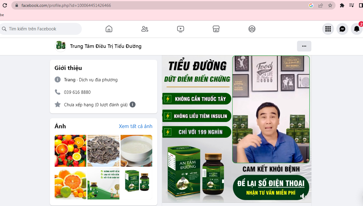 Đơn cử, tại fanpagefacebook có tên “Trung tâm Điều trị Tiểu đường” sử dụng những từ ngữ quảng cáo không hơn gì thuốc chữa bệnh như: “Bao năm chạy chữa khắp nơi – bỏ ra 1 phút cả đời khỏi lo”, đồng thời khẳng định rằng: “Khỏi là khỏi hẳn, không có chuyện đỡ đỡ” và “ổn định đường huyết về 5 – 6 chấm, ngăn ngừa các biến chứng mỡ máu, huyết áp, tim mạch; không còn phải phụ thuộc tây y hay insulin, hết tê bì chân tay, mờ mắt, mỏi mắt… trong khi bản thân viên uống An Tâm Đường này chỉ là TPBVSK.