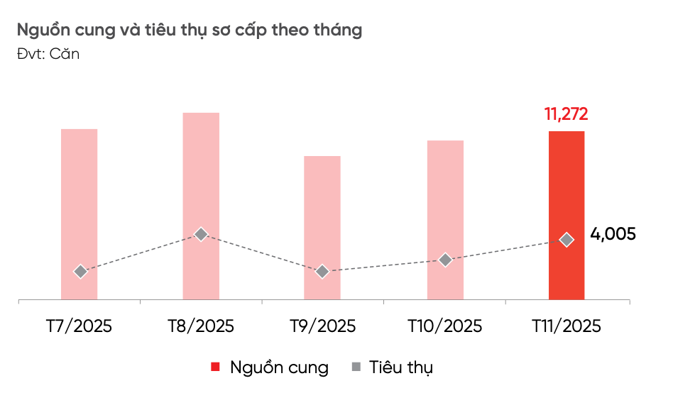 Sức cầu thị trường có sự cải thiện, lượng tiêu thụ tăng 2.6 lần so với T11/2024, tuy nhiên giao dịch vẫn còn thấp so với giai đoạn 2019 và tập trung ở những sản phẩm với mức giá bán trung bình dưới 3.5 tỷ Đồng/căn.