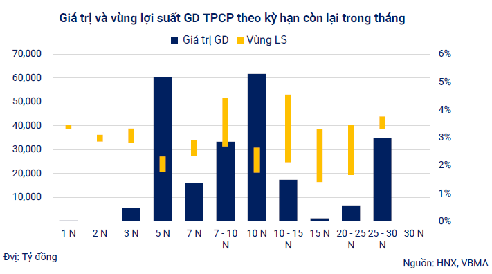 Về cơ cấu kỳ hạn, trái phiếu kỳ hạn 10 và 15 năm tiếp tục chiếm tỷ trọng lớn nhất, lần lượt khoảng 45% và 30% tổng giá trị phát hành trong tháng, cho thấy Chính phủ vẫn ưu tiên huy động nguồn vốn dài hạn với chi phí ổn định. Mức lợi suất trúng thầu có sự điều chỉnh tăng nhẹ, dao động quanh 2,4–2,6%/năm cho kỳ hạn 5 năm, 3,0–3,2% cho kỳ hạn 10 năm, và 3,4–3,6% cho kỳ hạn 15 năm.