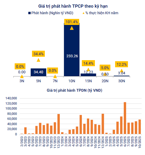 Tính chung 10 tháng đầu năm 2025, tổng giá trị TPCP do KBNN phát hành đạt 375.381 tỷ đồng, hoàn thành khoảng 85% kế hoạch huy động 440.000 tỷ đồng cho cả năm. VBMA đánh giá, tiến độ phát hành đã đáp ứng nhu cầu ngân sách trong ngắn hạn, song đà tăng chậm lại so với quý III do lãi suất trúng thầu có xu hướng tăng, đặc biệt ở các kỳ hạn dài trên 10 năm.