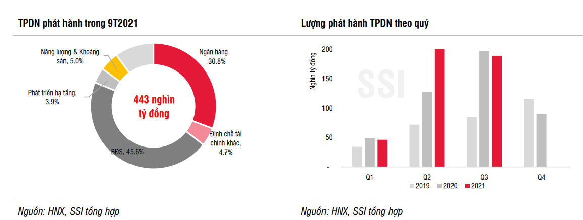 Tính chung 9 tháng năm 2021, tổng lượng TPDN phát hành là 443,1 nghìn tỷ đồng, tăng 18,6% so với cùng kỳ 2020. Quán quân phát hành vẫn là các doanh nghiệp BĐS (201,9 nghìn tỷ đồng – chiếm 45,5%); sau đó đến các ngân hàng (136,4 nghìn tỷ đồng – chiếm 30,8%); năng lượng và khoáng sản (21,9 nghìn tỷ - chiếm 5,0%); định chế tài chính phi ngân hàng (20,9 nghìn tỷ đồng – chiếm 4,7%); phát triển hạ tầng (17,5 nghìn tỷ - chiếm 3,9%); và các doanh nghiệp khác.
