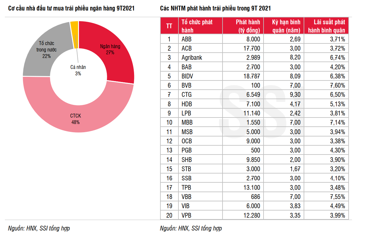 Trong Quý 3, khối lượng trái phiếu NH phát hành thành công đạt 65,2 nghìn tỷ đồng, giảm 6,8% so với Quý 2 nhưng tăng tới 37,9% so với cùng kỳ. Tính chung 9 tháng đầu năm 2021, có 20 NHTM phát hành 136,4 nghìn tỷ đồng (tăng 42,6% so với cùng kỳ) trái phiếu với kỳ hạn bình quân 4,13 năm và lãi suất bình quân 4,5%/năm. Nhu cầu các NHTM cần tăng vốn cấp 2 nhằm đáp ứng Basel 2 và bổ sung nguồn vốn trung hạn (hỗ trợ hoạt động kinh doanh và đáp ứng thông tư quy định về tỷ lệ vốn ngắn hạn cho vay trung dài hạn) tăng trong giai đoạn qua giúp thị trường trái phiếu NH sôi động.